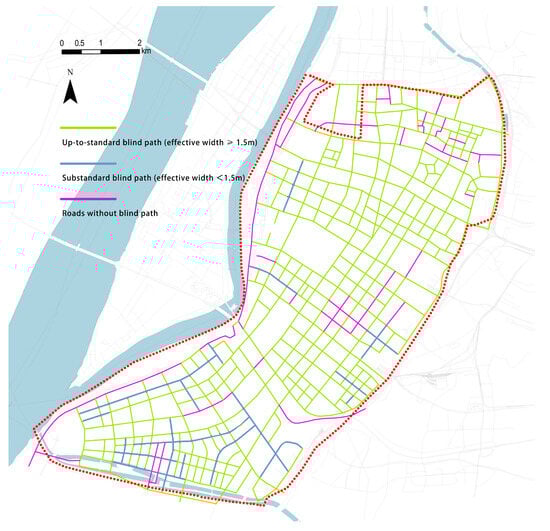 The study also identified 212.7 km (87%) of sidewalks with complete and continuous blind alleys, representing 87% of the total road length in the study area (Figure 12). These sidewalks, along with the entire road network featuring sidewalks with effective passing widths greater than 1.5 m, were selected as the fundamental data for subsequent calculations pertaining to the accessibility of park green spaces for the elderly and physically disabled populations.
