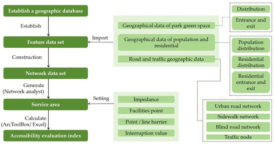 After determining the required geographic data and resistance value parameters for network analysis, data collection for the four elements of the network analysis—centers, nodes, links, and resistances—has been completed. The accessibility calculation and analysis can now be performed using the Network Analysis tool on the ArcGIS platform. The process primarily involves the following steps (Figure 13).