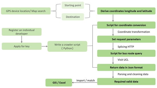 In this study, we innovatively developed Python scripts for data collection and integration, providing practical references for automated and intelligent planning and design. Compared to GIS network analysis, this method has several advantages in simulating bus travel. Firstly, the scripts can independently complete the collection and updating of a large amount of bus network and stop data, providing more accurate path information. Secondly, internet maps can incorporate real-time traffic flow factors and calculate routes that better align with people’s usage habits. Additionally, the scripts can query the cost time, total distance, and other information for each planned route in batches, and perform statistical analysis and accessibility calculations based on the returned data. In summary, this method allows for efficient data acquisition and precise analysis, significantly improving the reliability of the work and reducing the workload for researchers.