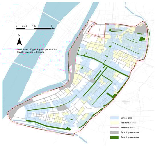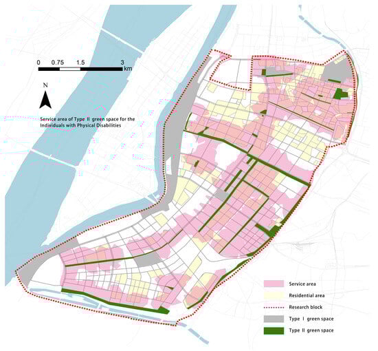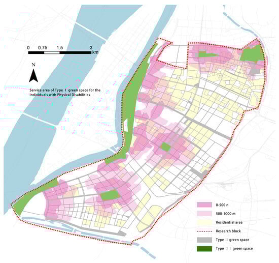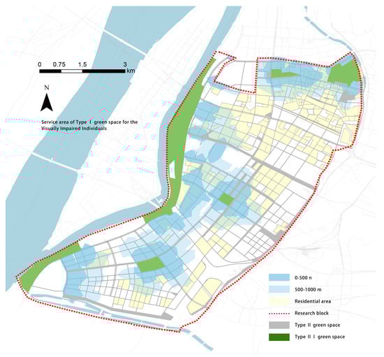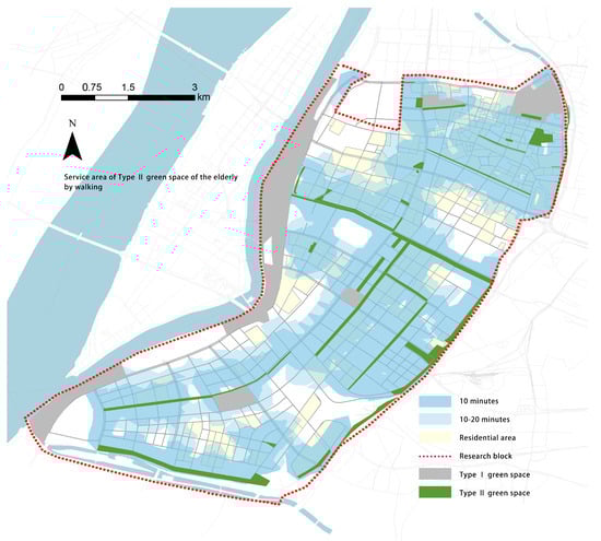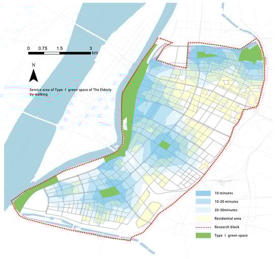 Service area of Type I green space by walking.