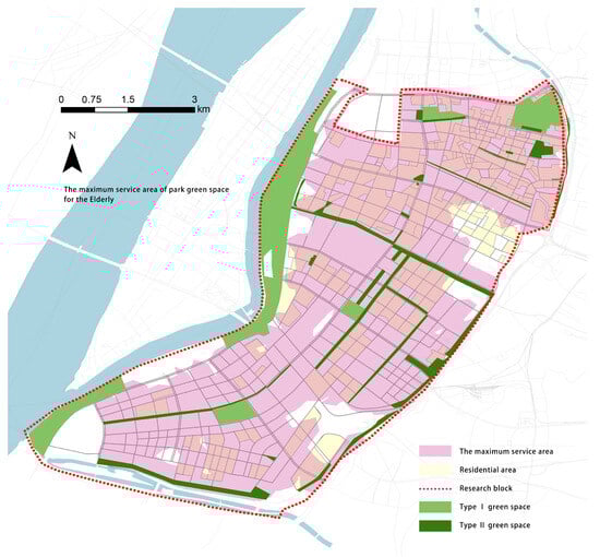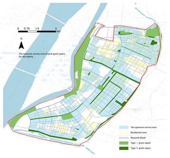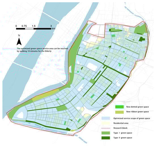 Optimized green space service area can be reached by walking 10 min for the Elderly.