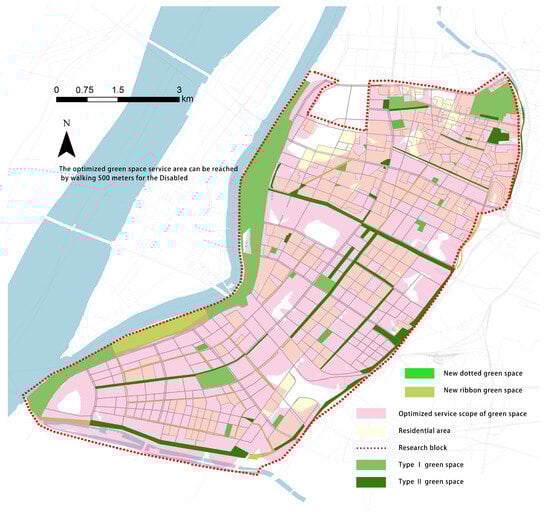 Optimized green space service area can be reached by walking 500 m for the Disabled.
