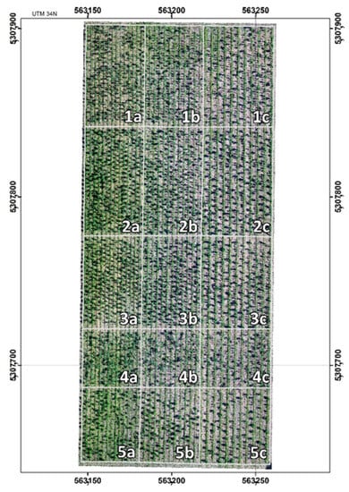 Orthophoto of the experimental plantation. Numbers indicate the clones (1: PL251; 2: NK1; 3: PL040; 4: NK2; 5: Üllői), and the letters specify the planting spacings (a: 2.5 × 2.5 m; b: 3.0 × 3.0 m; c: 4.0 × 4.0 m) (taken by Szabó, G., Napkor, 16 June 2022).