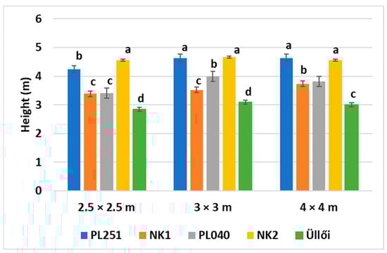 Tree height is a fundamental measure in forestry. It is used to assess the productivity of a site. Furthermore, it is related to aboveground biomass and canopy vertical structure. It can be a good proxy for forest status and useful in forecasting stand development and succession. The height of the clones in the case of different planting spacings is shown in Figure 3. NK2 reached the highest mean height (4.56 m) when planted in a 2.5 × 2.5 m space, with a significant difference from the others. PL251 performed second best (4.24 m), while NK1 and PL040 were not significantly different in their height (3.39 and 3.41 m, respectively). Tendency in a 3 × 3 m space was similar; NK2 and PL251 were the highest but with no significant difference (4.63 and 4.66 m), while NK1 was the shortest among all (3.52 m). There was no considerable difference in the clones’ order in the case of 4 × 4 m spacing. ’Üllői’, the only commercially available clone, showed the worst performance in all spacing plantations (2.8, 3.09, and 3.01 m in the case of 2.5 × 2.5 m, 3 × 3 m, and 4 × 4 m spacing, respectively).