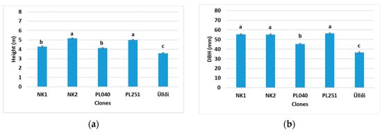 Comparison of the clones in 2.5 × 2.5 m planting spacing by height (m) (a) and diameter at breast height (DBH) (mm) (b), based on measurement of 30 sample trees (15 June 2022), ±standard error; small letters indicate the significant differences among the clones at p = 5% level.