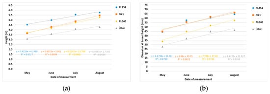 In the main growing period of May–August, trends in height and DBH increments by clones are shown in Figure 5a,b. A linear trend in height growth rate was found in the cases of NK1 and PL040, while growth rate decreased after July in PL251 and ‘Üllői’. The DBH increase rate was lower after July in the case of all four clones. Close to one-third of the change in height and more than half of the DBH increase occurred between May and June. Regarding DBH, PL251 showed extraordinary performance, with a 66% increase in this period.