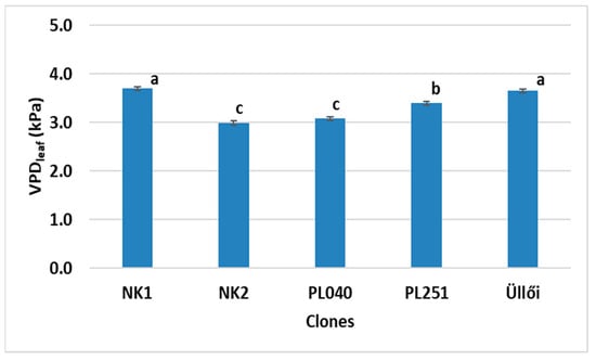 Vapor pressure deficit (VPD) has a major impact on plant assimilation and transpiration processes, such as stomatal opening and CO2 uptake. High VPD means dry air for the plant, and it can easily become too dry and stressed. The VPD values were relatively high at the time of measurement (3.0–3.8 kPa), suggesting that the very dry air around the plants induced high water stress. The VPD values of clones NK2 and PL040 were significantly lower than those of the other clones, indicating better stress tolerance (Figure 6).