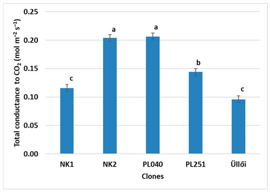 Comparison of the clones by total conductance to CO2, ±standard error; small letters indicate the significant differences at p = 5% level.