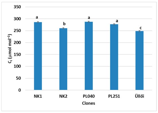 Significant differences in the intercellular CO2 (Ci) concentration of the clones’ leaves were found among the clones at a p value of 5%. The highest Ci values were observed in clones NK1 (286.15 µmol mol−1), PL040 (287.37 µmol mol−1), and PL251 (277.20 µmol mol−1). ‘Üllői’ had the lowest Ci value with 248.30 µmol mol−1 (Figure 8). Many factors have effects on the Ci. It cannot be taken as a clear indicator for assessing the stress status of the plant or the functioning of the photosynthetic system.