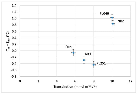 As Figure 9 shows, there were differences in air and leaf temperatures among black locust clones as a function of transpiration. Kutasy et al. [40] also demonstrated that air and leaf temperature differences provide information on the water status of plants, and a higher difference means a better cooling effect from transpiration. Because the leaf’s stomata are closing under water stress, the cooling effect is reduced. On the date of measurement (29 June 2022), black locust clones had shown various water statuses: clones PL040 and NK2 were relatively good, they were able to cool their leaves, but the others (NK1, PL251, ‘Üllői’) were in water stress. In the case of transpiration, we found the same results. NK2 produced the highest transpiration (10.07 mmol m−2 s−1) and PL040 had the largest air–leaf temperature difference (1.03 °C). However, there was no significant difference between these two clones in these two parameters. The leaf cooling effect was very low in clones PL251, NK1, and ‘Üllői’, at −0.44, −0.29, and −0.06 °C, respectively. These three were not significantly different from each other.