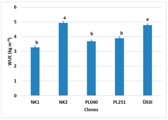 Comparison of the clones by water-use efficiency (WUE), ±standard error; small letters indicates the significant differences at the p = 5% level.