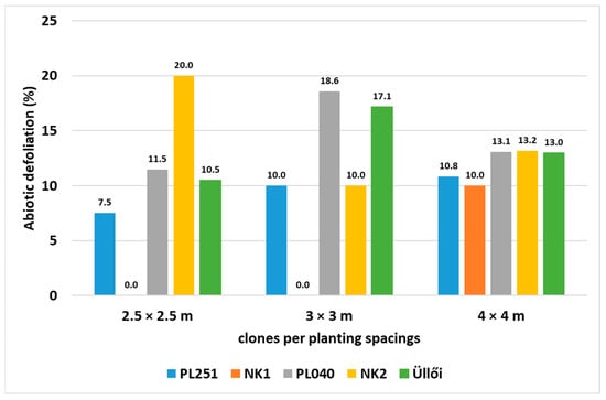 Drought and wind were found to be the main environmental stressors leading to defoliation until September 2022. However, all the investigated clones were found to show low vulnerability despite the extreme drought in the study area during the investigation period. Among all, NK1 showed the highest resistance regarding defoliation, 0% in the case of row distances of 2.5 × 2.5 m and 3 × 3 m, and 10% in the case of 4 × 4 m. Nevertheless, the contribution of other factors at the production site cannot be ignored. The drought resistance of the different clones can be expected to be different under similar weather conditions but with different planting spacings, for example (Figure 11).