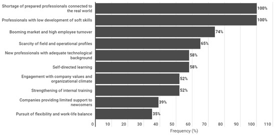 Brazil is experiencing a moment of increased job offers and a heated market, as highlighted by 74% of the organizations as a current scenario in our first survey. Besides this, 100% of the organizations studied recognized a shortage of professionals prepared for the current job requirements. In addition, all organizations pointed out that new graduates lack training in soft skills [10]. The survey also showed that new professionals displayed an adequate technological background (58%) and were autonomous in learning (58%), possibly related to a result pointed out by 65% of the interviewees who recognize a lack of adequate training in the management of operations and field activities for new professionals. The survey showed that newly employed professionals have a profile more connected to the values of the organization (52%) and search for jobs that generate a better balance between their professional and personal life (35%). Finally, 52% of interviewees recognize the need to improve their internal technical training of professionals, while 39% feel that they do not provide enough support for the technical training of newly hired employees.