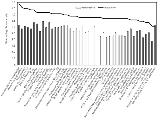 The most important skills indicated by professionals (20%) from academia and the job market were oral and written communication, problem-solving, proactivity, leadership and teamwork, practical experience outside of academia, use of analytical software data, use of the Excel program (Microsoft® Excel ® 2016), use of basic forest statistics, project development and management, and silviculture of planted forests (Figure 2). The dark bars in Figure 2 correspond to the first 20% of the largest gaps between importance and performance, encompassing problem-solving abilities, oral and written communication, project development and management, leadership and teamwork, practical experience outside academia, and proactivity. The other third is composed of REDD+ and clean-development mechanisms, integrated landscape management, and the carbon market.