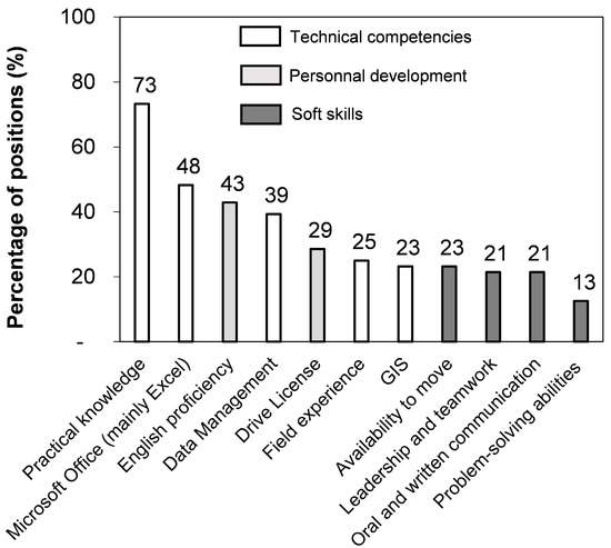 In this survey, a sample of 200 job offers announced on social networks (LinkedIn, Facebook, WhatsApp, Instagram, and Telegram) were searched as well as offers announced on company websites from July 2018 to April 2023. All skills, knowledge, and job requirements were grouped into the categories of technical skills, that is, those acquired during the undergraduate course program with a direct relationship to the curriculum in a forest-engineering course, such as forest inventory, silviculture, or mathematics; soft skills (teamwork or leadership skills); and personal skills (required for a particular job opening, such as a driver’s license or English skills).
