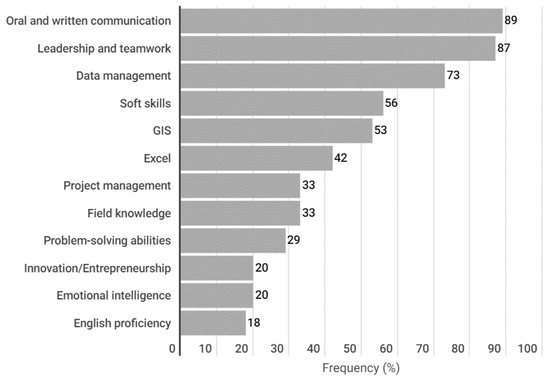 The skills considered most relevant by at least 50% of new graduates (<5 years) interviewed were oral and written communication, leadership and teamwork, programming and data analysis, soft skills in general, geoprocessing, and GIS techniques (Figure 4).