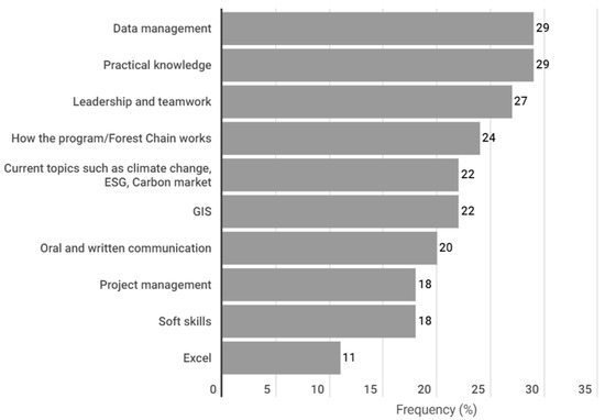 Skills considered most important for new graduates (<5 years) who work in organizations linked to forest engineering. The questionnaire used essay questions; thus, their emergence demonstrates their relevance even with a relatively low percentage.