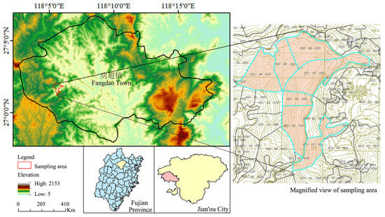 The experimental and soil sampling sites in this study are those previously described for the study of soil bacteria communities []. The experimental site is in Fangdao Town, Jian’ou City, Fujian Province, China (26°38′–27°20′ N, 117°58′–118°57′ E) (Figure 1). The soil is ordinary mountain red soil developed by granite, and the zonal vegetation is evergreen broad-leaved forest, with the main tree species including Phyllostachys edulis, Cunninghamia lanceolata, Phoebe bournei, and Schima superba. The area has a subtropical maritime monsoon climate. The climatic conditions in this region are ideal for the growth of Moso bamboo owing to abundant rainfall, with annual rainfall of 1600–1800 mm, and annual average temperatures of 14–20 °C. Jian’ou City ranks among the top counties and cities in China in terms of Moso bamboo area regarding bamboo number, bamboo timber, and fresh bamboo shoot production []. The area of Moso bamboo forest in Fangdao Town is 8400 ha, accounting for more than 47% of the total forest area of the town. The area of the experimental forest is larger than 70 ha; Moso bamboo has an average density of 2500/ha and a height of 16 m, and the growth is concentrated over a large area. A range of 400–600 mature standing bamboo stands per ha are cut down annually, and a similar number of new bamboo stumps are left behind yearly.