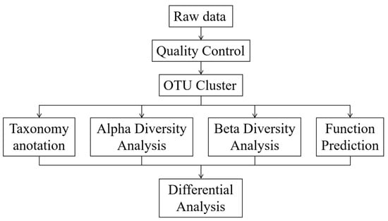 Amplicons were extracted from 2% agarose gels and purified using the AxyPrep DNA Gel Extraction Kit (Axygen Biosciences, Union City, CA, USA.) according to the manufacturer’s instructions, and quantified using QuantiFluor -ST (Promega, Madison, WI, USA). Purified amplicons were pooled in equimolar concentrations and paired-end sequenced (2 × 250) on an Illumina platform according to the standard protocols. The raw reads were deposited into the NCBI Sequence Read Archive (SRA) database. A flow chart of the bioinformatics analysis is shown in Figure 2. Sequencing was performed by Guangzhou Gene Denovo Biotechnology Co., Ltd. (Guangzhou, China).