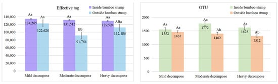 - The soil fungi OTUs and diversity and richness indices were higher inside than outside the stumps. The soil fungi OTUs and diversity and richness indices outside the bamboo stumps decreased with increasing degrees of decomposition. The soil fungi OTUs and diversity and richness indices inside the bamboo stumps were highest in moderate decomposition and lowest in heavy decomposition.