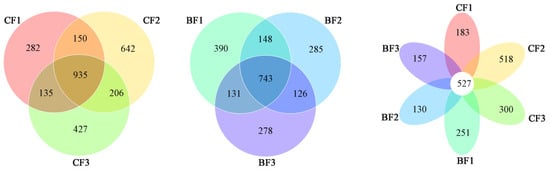 OTU Venn diagrams of soil fungi inside and outside of bamboo stumps with different degrees of decomposition. Note: CB1, CB2, and CB3 indicate mildly, moderately, and heavily decomposed soil samples inside the bamboo stumps, respectively; BB1, BB2, and BB3 indicate mildly, moderately, and heavily decomposed soil samples outside the bamboo stumps, respectively.