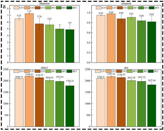 In general, the Chao1, ACE, Shannon, and Simpson indices show that the diversity index was greater inside than outside the bamboo stumps at the same degree of decomposition. The diversity index was highest for the stumps at a moderate degree of decomposition, while the diversity index decreased with the increasing degree of decomposition outside the stumps (Figure 5a). The distance between the samples outside and inside the stump was larger than that between the samples with different degrees of decomposition (Figure 5b), which indicates that the difference in soil fungal communities outside and inside the bamboo stumps was larger than that between the different degrees of decomposition.