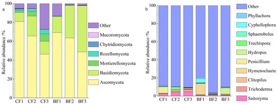 Relative abundance of soil fungi at the phylum level (a) and genus level (b) inside and outside of bamboo stumps with different degrees of decomposition. Note: CB1, CB2, and CB3 indicate mildly, moderately, and heavily decomposed soil samples inside the bamboo stumps, respectively; BB1, BB2, and BB3 indicate mildly, moderately, and heavily decomposed soil samples outside the bamboo stumps, respectively.