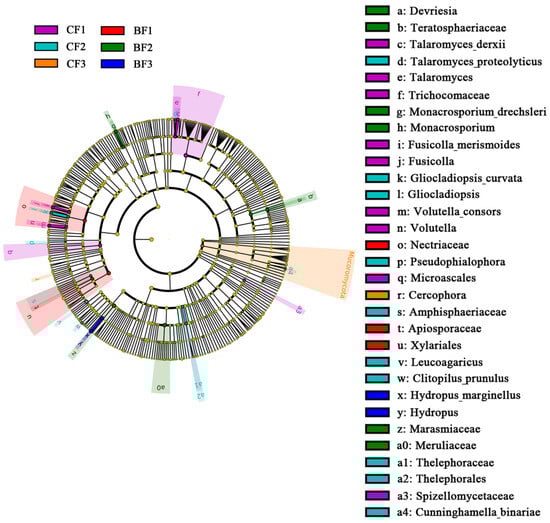 LEfSe analysis is used to identify important species that are significantly different between groups. The circles radiating from inside to outside in the LEfSe analysis figure refer to the taxonomic levels from phylum to species. The different colored nodes indicate the different microbial classes that play an essential role in the group: significantly different species are colored according to group, and species without significant differences are colored uniformly in yellow (Figure 7). At the phylum level, the abundance of Mucoromycota inside heavily decomposed bamboo stumps was the highest among all the groups. At the genus level, the abundances of Talaromyces, Fusicolla, and Volutella inside mildly decomposed stumps were the highest among all the groups; the abundances of Gliocladiopsis, Pseudophialophora, and Leucoagaricus inside moderately decomposed stumps were the highest among all the groups; and the abundance of Cercophora in heavily decomposed stumps was the highest among all groups. The relative abundances of Devriesia and Monacrosporium outside heavily decomposed bamboo stumps were higher than those of other groups. Likewise, the relative abundance of Hydropus outside heavily decomposed bamboo stumps was higher than those of other groups.