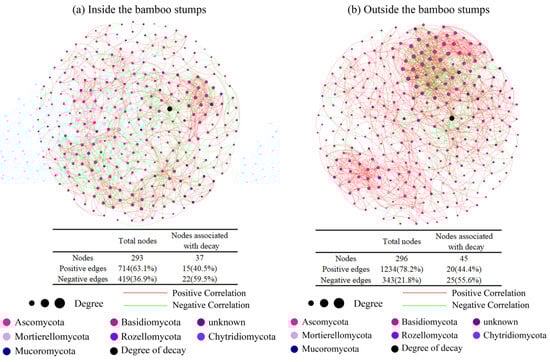 Symbiotic network of soil fungi OTU inside (a) and outside (b) the stumps of Moso bamboo.
