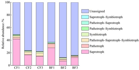 The presence of a large number of fungi in the soil is only partially due to saprophytic fungi. In this study, the saprophytic fungi around the bamboo stumps were the main nutritional types defined, which may be related to the richness of wood fibers that can provide nutrients to the saprophytic fungi in the adjacent soil []. The relative abundance of saprotroph trophic modes was higher inside than outside the bamboo stumps, decreasing gradually with an increase in decomposition. The relative abundance of saprotroph trophic modes around mildly decayed bamboo stumps was significantly higher than that around moderately and heavily decayed stumps (Figure 8). This may be a result of the decay process of bamboo stumps, in which the substrate declines with decay, thus affecting the growth of saprophytic fungi and leading to their reduction []. The relative abundance of pathotrophic fungi was higher outside than inside the bamboo stumps, probably because pathotrophic fungi need to obtain nutrient sources from host cells. The bamboo stump felling piles are connected to the disjointed subterranean whip root system of other Moso bamboo forests, and while some of the bamboo whips are still active, they provide hosts for the growth of pathotrophic fungi, which can grow through mycelium that can successfully penetrate the pores in the soil of the forest floor []. In addition, most of the fungal functions (51.02%–87.38%) in this study are still not annotated, especially in fungi that are particularly abundant in the middle and late stages of bamboo stump decay. These complex fungal functions are well worth further in-depth study.