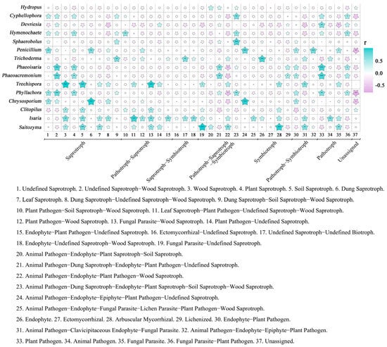 The top 15 dominant genera with high relative abundances were selected for correlation analyses with 37 functional guilds at the genus level, identifying 12 dominant genera closely correlated with various functional fungi with saprotroph trophic modes. Among these, Isaria was significantly (0.01 < p < 0.05) or highly significantly positively correlated (0.001 < p ≤ 0.01, p ≤ 0.001) with 11 functional fungi with saprotroph trophic modes. The genera Saitozyma and Trechispora were significantly (p < 0.05) or highly significantly positively correlated (0.001 < p ≤ 0.01, p ≤ 0.001) with more than five functional fungi with saprotroph trophic modes. Most of the dominant fungi at the genus level were negatively correlated with undefined functional guilds, with Penicillium and Phyllachora showing highly significant negative correlations with undefined functional guilds (0.001 < p ≤ 0.01) and Chrysosporium showing significant negative correlations with unassigned functional guilds (0.01 < p < 0.05) (Figure 10).