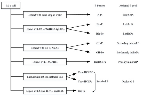 A detailed investigation of P dynamics and bioavailability requires the separation and identification of different forms of P in soils [12]. Sequential fractionation is one of the most commonly used methods to study soil P dynamics owing to its advantages of low operating cost, small amount of samples needed, and practicality [13,14]. The P fractionation procedure of Hedley et al. [15] and its modification by Tiessen and Moir [16] are the most commonly used [17,18,19]. Based on the different solubility and mobility of soil inorganic P (Pi) and organic P (Po), the procedure can be used to extract each soil P fraction sequentially with a series of chemical reagents [15,20]. Each of these fractions plays an important role in the transformation of soil P. However, a separate soil P fractionation cannot evaluate the interaction among various P fractions.