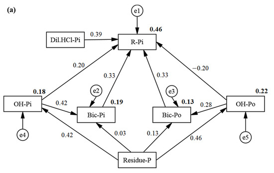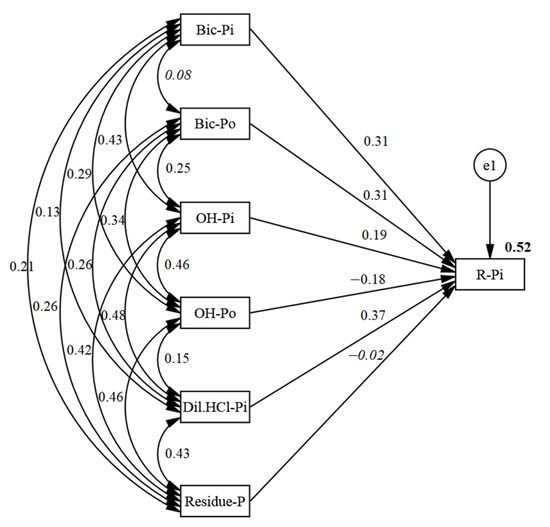Path analysis (Figure 2) revealed that Bic-Pi, Bic-Po, OH-Pi, OH-Po, and Dil.HCl-Pi had a significant direct effect on R-Pi (standardized β = 0.31, 0.31, 0.19, −0.18, and 0.37, respectively; p < 0.05), whereas Residue-P did not have a significant direct effect on R-Pi (β = −0.02; p > 0.05).