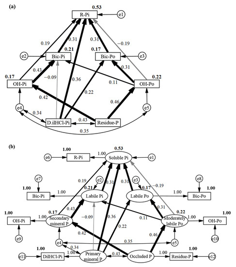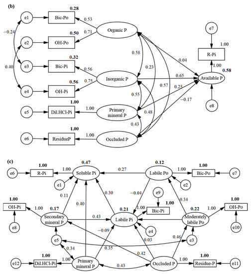 Model D (p = 0.63, RMSEA < 0.001; Figure 4a) was the optimal model redetermined according to the prior path model (Figure S1). On the basis of model D, model E further respecified the structural model formed by introducing the latent variable (soil P pool), that is, each soil P fraction was used as the index of a soil P pool (Figure 4b). This model had the same degree of fit as model D. Model E combined sequentially extracted soil P fractions with functional soil P pools and solved the connection problems between the fraction and the pool. Such problems included the measurement errors of soil P fractions and the incomplete extraction of soil P pool by reagents [40].