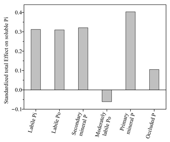 The path coefficients between soil P pools in model E were the same as those between their corresponding indicators (i.e., soil P fractions in model D) (Figure 4). Similar to the path analysis (Figure 2), Model E showed that soluble Pi had significant direct positive effects on labile Pi (standardized β = 0.31, p < 0.001), labile Po (β = 0.31, p < 0.001), secondary mineral P (β = 0.19, p < 0.001), and primary mineral P (β = 0.36, p < 0.001), whereas moderately labile Po (β = −0.19, p < 0.001) had significant direct negative effects (Figure 4b). The standardized total effect on soluble Pi was the largest for primary mineral P (β = 0.40), followed by secondary mineral P (β = 0.32), labile Pi (β = 0.31), labile Po (β = 0.31), and occluded P (β = 0.11), and it was the smallest for moderately labile Po (β = −0.06) (Figure 5).