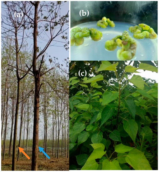 Materials used in this study: (a) Yellow arrow indicates light-barked C. bungei C. A. Mey, blue arrow indicates wrinkled-barked C. bungei C. A. Mey; (b) callus; (c) C. bungei C. A. Mey material for callus induction.