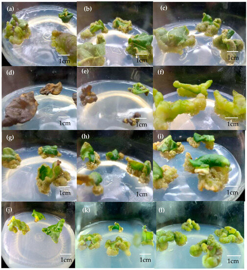 As shown in Table 6, the induction rates of groups J and K without the addition of elicitor medium were 71.11% and 65.56%, respectively. There was a 100% induction rate in the J-SA1 group with 10 μmol·L−1 SA added to medium J. Secondly, the induction rate was also significantly increased in the K-SA1 group with 10 μmol·L−1 SA added to medium J, and the induction rate was 92.22%. This indicated that 10 μmol·L−1 SA had a significant stimulative effect on the induction of leaf callus. When the concentration of SA was increased to 50 μmol·L−1, the induction rate tended to decrease, and the addition of 100 μmol·L−1 SA even had an inhibitory effect on the induction of calluses. The addition of YE to media J and K did not have any significant effect on the callus induction rate, whereas 200 mg·L−1 of YE had an inhibitory effect on callus induction.