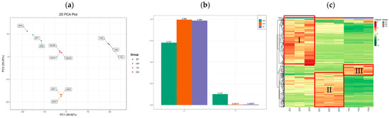 SPSS 22.0 software was used for statistical analysis of the data. One-way analysis of variance (ANOVA) was used to analyze the different treatments, and then the Duncan test was used to make multiple comparisons. The significance level was set as a = 0.05. All data were expressed as mean ± standard error (SE). Unsupervised PCA (principal component analysis) was performed using statistics function prcomp within R (www.r-project.org) accessed on 31 August 2022. The data were unit-variance scaled before undergoing unsupervised PCA. SigmaPlot 10.0 software was used for drawing.