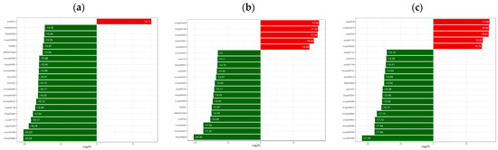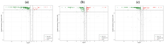 Volcanic maps of differential metabolites: (a) ZP vs. YS group; (b) ZP vs. GP group; and (c) GP vs. YS group.