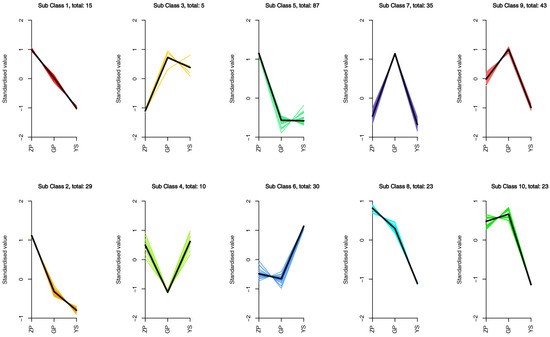 K-means clustering analysis. The horizontal axis represented the grouping of samples, the vertical axis represented the standardized relative content of metabolites, Sub Class represented the category number of metabolites with the same trend of change, and total represented the number of metabolites in that category.
