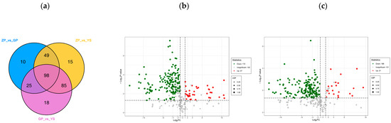Screening of differential metabolites of flavonoids: (a); Venn diagram analysis of metabolites in ZP vs. YS group, ZP vs. GP group and GP vs. YS group; (b) volcanic map of differential metabolites in GP vs. YS group; (c) volcanic map of differential metabolites in ZP vs. YS group. Each dot represented a metabolite. Green dots in the figure represented differentially expressed metabolites with down-regulated relative content, red dots represented differentially expressed metabolites with up-regulated relative content, and grey dots represented metabolites that were detected but had insignificant differences in relative content. Numbers in the legend represented the number of individuals.