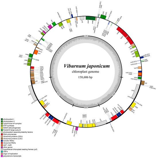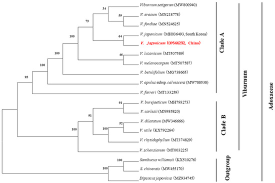 - Cho, W.B.; Han, E.K.; Choi, H.J.; Lee, J.H. The complete chloroplast genome sequence of Viburnum Japonicum (Adoxaceae), an evergreen broad-leaved shrub. Mitochondrial DNA B Resour. 2018, 3, 458–459. [Google Scholar] [CrossRef]