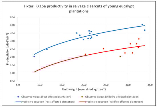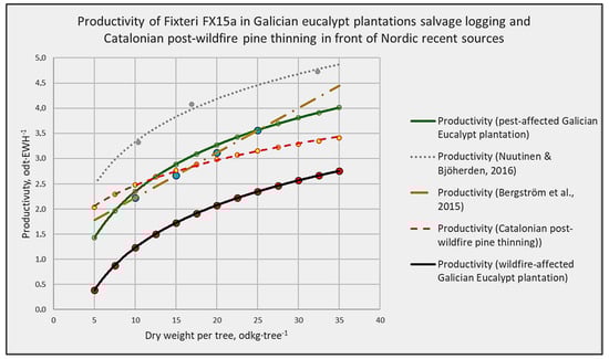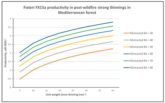 The results of the Catalonian post-wildfire thinning, assuming the total extraction of basal area, are similar—or slightly lower for unit weights over 13 odkg·tree−1—to the pest-affected Galician salvage logging, and the same is true if compared to [3]. So, they are clearly lower—much lower for the greater tree sizes—than the productivity recorded by [38], which probably reflects the stand heterogeneity and poorly planned work in the Catalonian case.