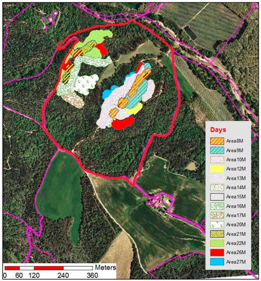 The zones covered daily by the Fixteri’s work, in distinct colors or frames for each day, are depicted in Figure 3, as obtained from the GPS data. The work pattern seems not to be systematic, with frequent movements over areas previously treated. This reflected changes of criteria by the private forest owner, forcing the machine driver to come back to some stands already thinned, and the traditional method of mechanized thinning in the region, working from already existent temporary roads and avoiding opening a parallel net of strip roads. These factors obliged the machine driver to come back through the same temporary roads to continue work where he had finished the day before.