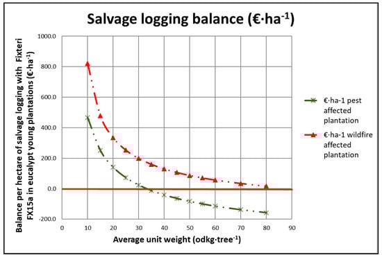 Under the cost assumptions reflected in the Methodology chapter, curves predicting unit costs for felling and bundling were built, separately for the pest- and wildfire-affected eucalypt plantations. Those costs were added to the rest of harvesting, transport, chipping, and other costs, besides the supplying of company profit, and were compared with the income from the selling of the chips on a per-hectare basis. The results are shown in Figure 4. Using as an explanative variable the dry extracted weight per tree, the self-financing limit would reach 33 odkg·tree−1 (around 69 fresh kg·tree−1) in the pest-affected plantation, but the wildfire-affected one would only achieve a unit weight of 80 odkg·tree−1, far from the observed values.