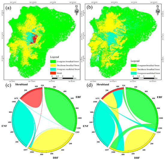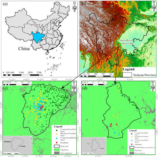 Overview of the study area. (a) The location of Sichuan Province. (b) The location of the study area. (c) The study area and field investigation sample plots for classification. (d) The transferability assessment area and field investigation sample plots.