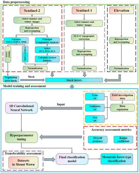 This study aimed to develop a 1D CNN for mountain forest classification, which consisted of two primary parts. The first part was data preprocessing, including Sentinel-2 optical data, Sentinel-1 SAR data, and elevation data. Meanwhile, the OTSU method and remote sensing indices were employed to obtain the vegetation area of Mount Emei. The second part was model training and assessment, including model construction, hyperparameter tuning, and model iteration. Performance evaluation metrics such as overall accuracy (OA) and kappa coefficient (Kappa) were employed to assess the accuracy of the model. Furthermore, to assess the transferability of the model, it was applied to the forest type classification of another region (Mount Wawu). The detailed process is shown in Figure 2.