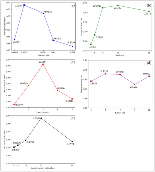 The variation trend of each hyperparameter. (a) Learning rate. (b) Batch size. (c) Layer number. (d) Kernel size. (e) Kernel number in the first layer.