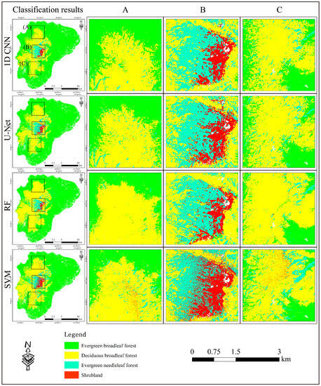 The comparison with the U-Net, random forest, support vector machine. The left column shows the classification results of the three classification models, with (A–C) representing the details of the three small areas.