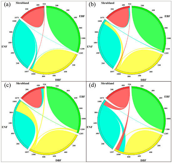 The order of the features is shown in Table 4. When utilising the multispectral bands and vegetation indices of Sentinel-2 as inputs to the 1D CNN, the convolutional neural network became proficient in discerning the distinctive spectral characteristics of various forest types. Notably, the vegetation red-edge bands in Sentinel-2 significantly magnified the dissimilarity in spectral characteristics among distinct forest types. Through the analysis of the reflectance differences across these bands, the classification of mountain forest types could be achieved. However, upon introducing multiseasonal Sentinel-2 data inclusive of vegetation indices differences, the change in spectral characteristics across diverse forest types during different seasons diverged. For instance, the discrepancy in vegetation indices for EBF was comparatively minor, while that for DBF was more pronounced. This phenomenon served to enhance classification accuracy to a greater extent (Section 5.3).